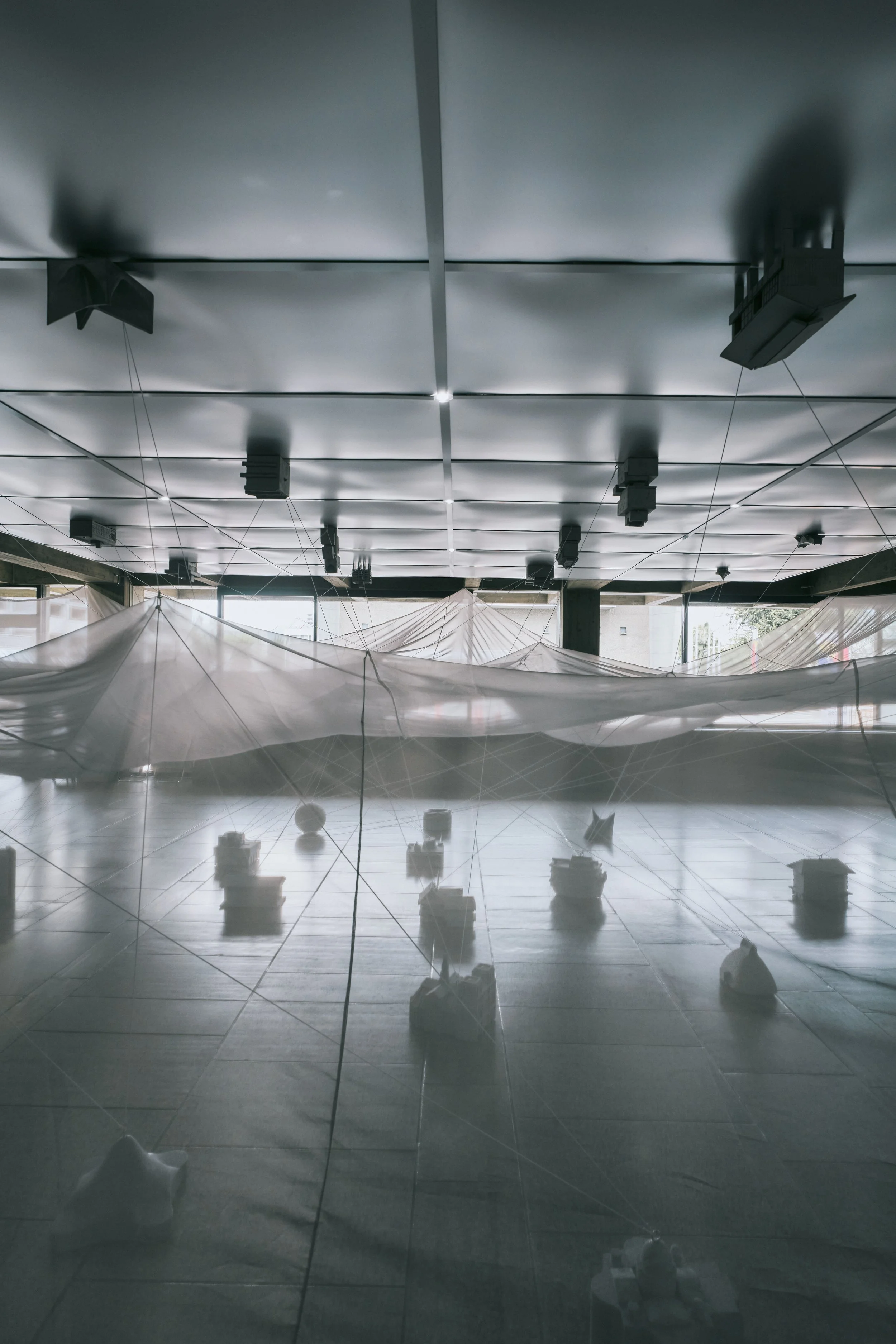 Tange's Civic Hall served as the stage for this work. Since we could not drill holes into this historic building and its reinforced concrete ceiling, we had no choice but to install a temporary ceiling. We secured the framework to the beams with clamps and constructed the surface using lightweight panel materials. Ideally, we wanted to use mirrored panels. The kawara ceramic objects were arranged in a 4x4 grid and fixed to the ceiling framework. The challenge lay in positioning the holes in the organdy fabric and the stone objects. To translate a diagrammatically sorted relationship into a three-dimensional space, we ran an optimization program to ascertain placements of stone objects and holes, based on three simple rules: 1) Stone objects must be at least 1 meter apart; 2) Rubber cords must not entangle; and 3) Rubber cords connecting ceramics-fabric-stones must be the shortest possible. After over 60,000 permutations, we finally found the optimal arrangement.