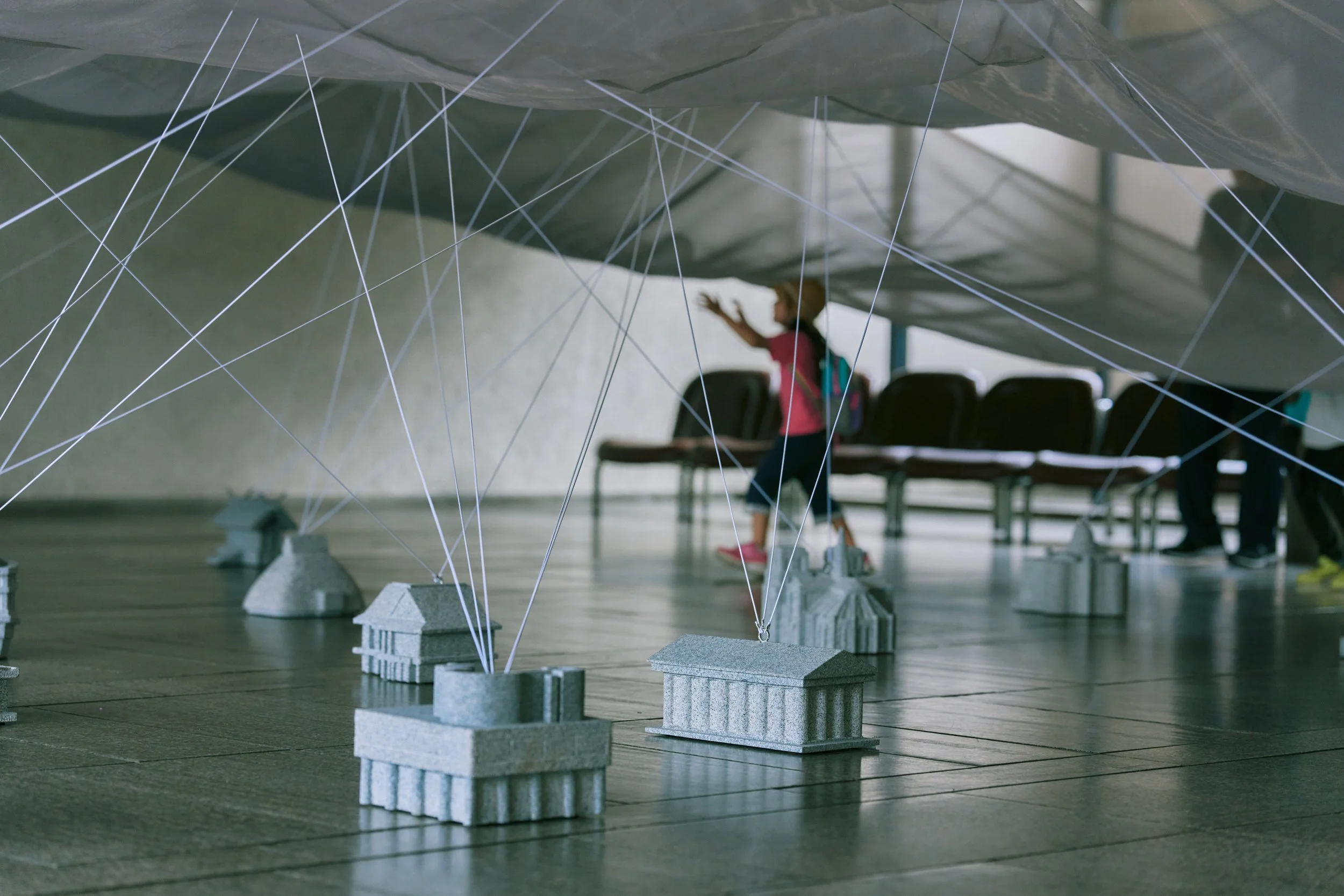 As visitors move rubber threads and stone objects, the undulating “waves” of the fabric constantly shift and able to reposition the spheres. This interactive experience prompts viewers to consider how diverse inspirations, cultural backgrounds, and historical seeds within each of us evolve through a process leading to final creations. Visitors will find an opportunity to overlay their own thought processes onto this space and create their own personal “thought map.”