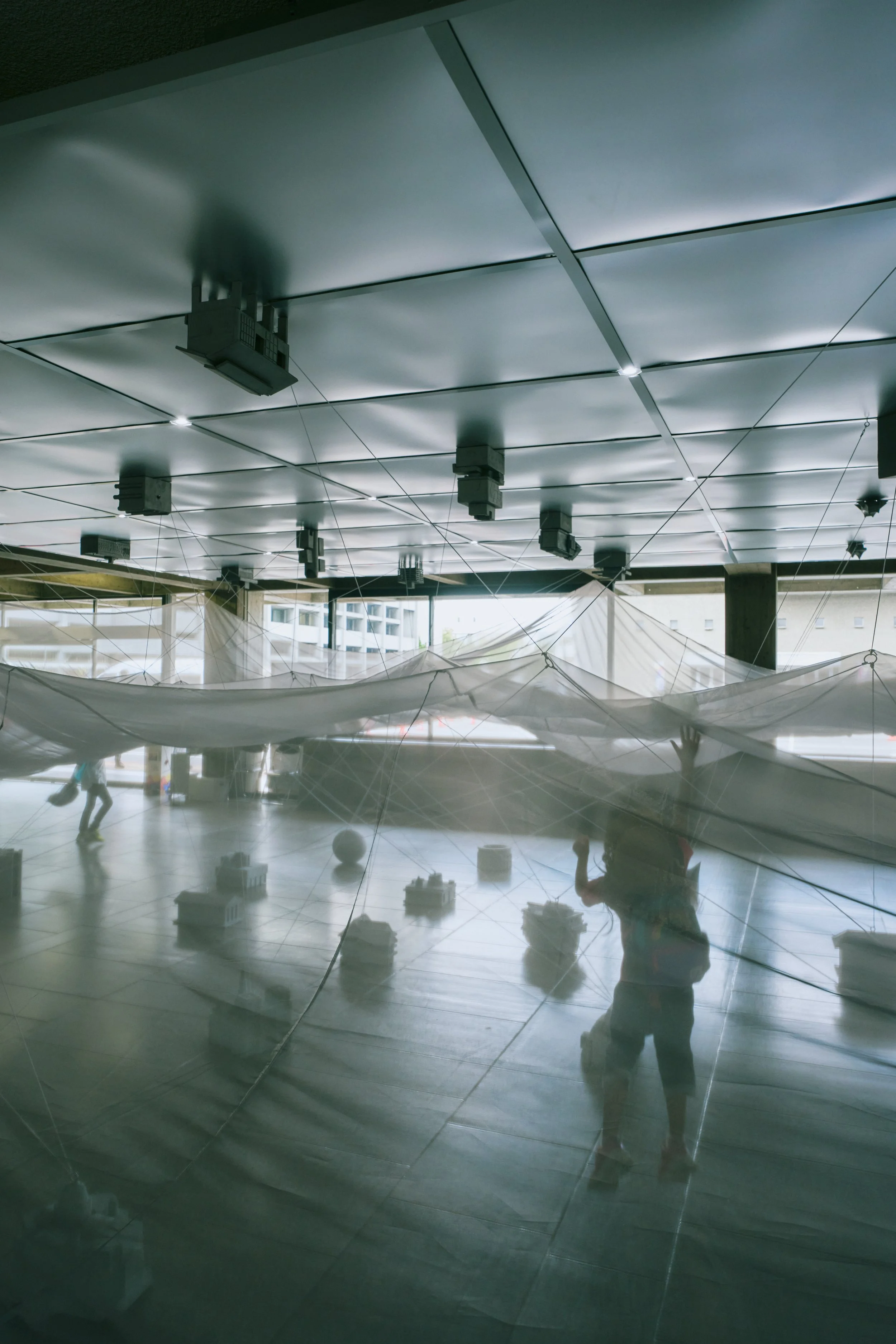 この作品において、オーガンジーの布は単なる空間の仕切りではありません。それは、丹下のインスピレーションの種と、それが建築へと昇華する「境目」にある「脳の皺」を表現しています。起伏に富んだ布の表面には球体が置かれており、最小抵抗の経路を進んで結晶化する過程を、来場者は紐や布を動かすことで体現できます。